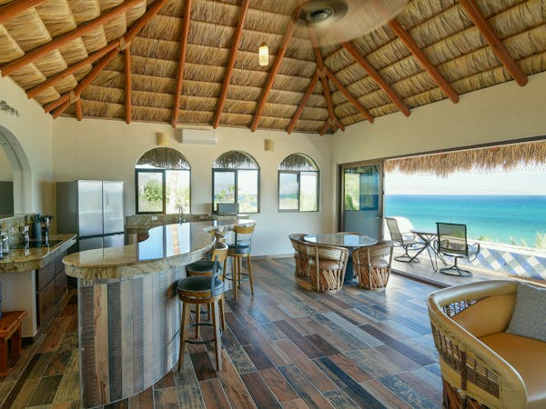 Cuenta con una amplia palapa tradicional como techo, una cocina completamente equipada, una cama King y espacios abiertos que invitan a relajarse y disfrutar de la brisa marina.