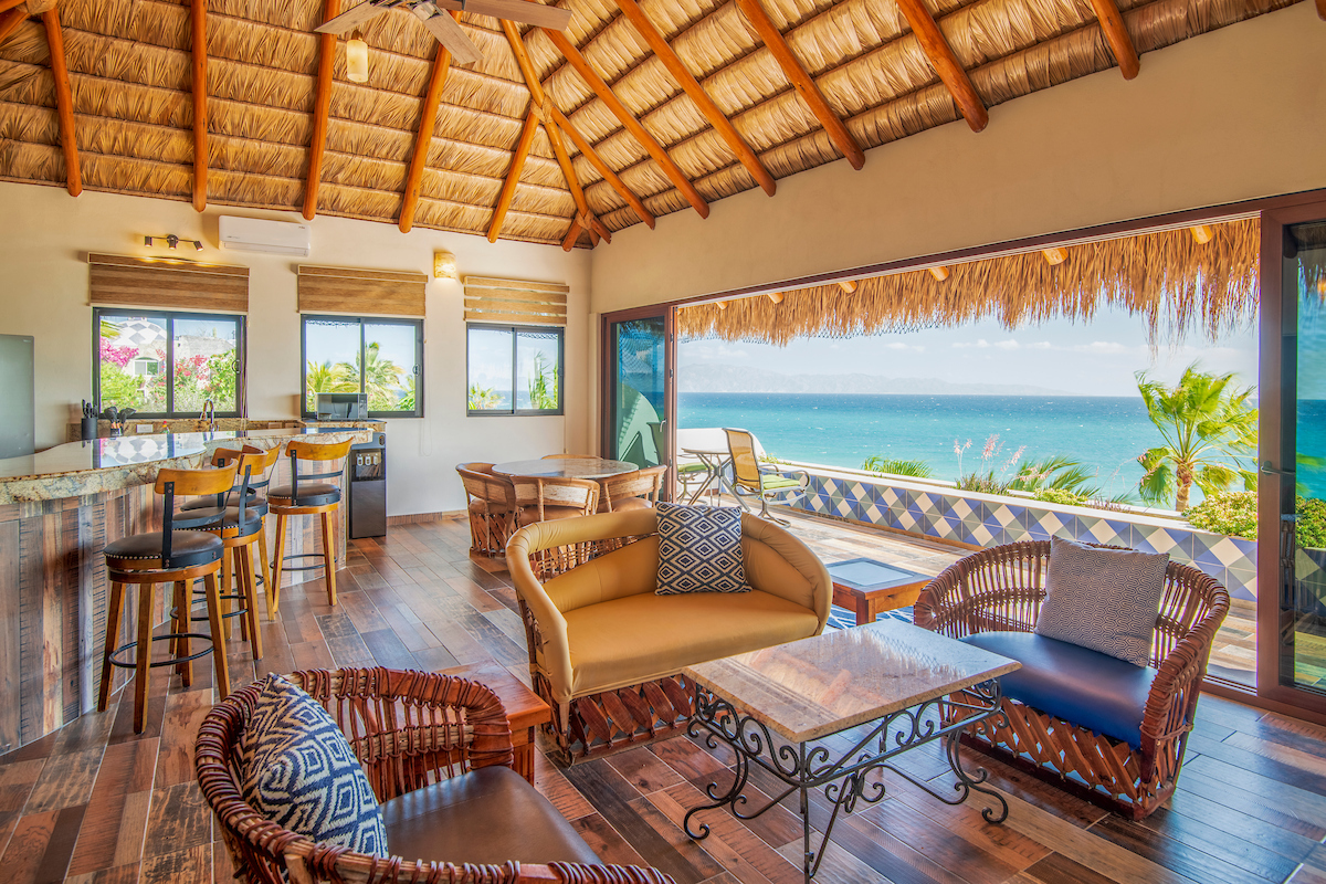 It features a spacious traditional palapa roof, a fully equipped kitchen, a King bed, and open spaces designed for relaxation while enjoying the ocean breeze.